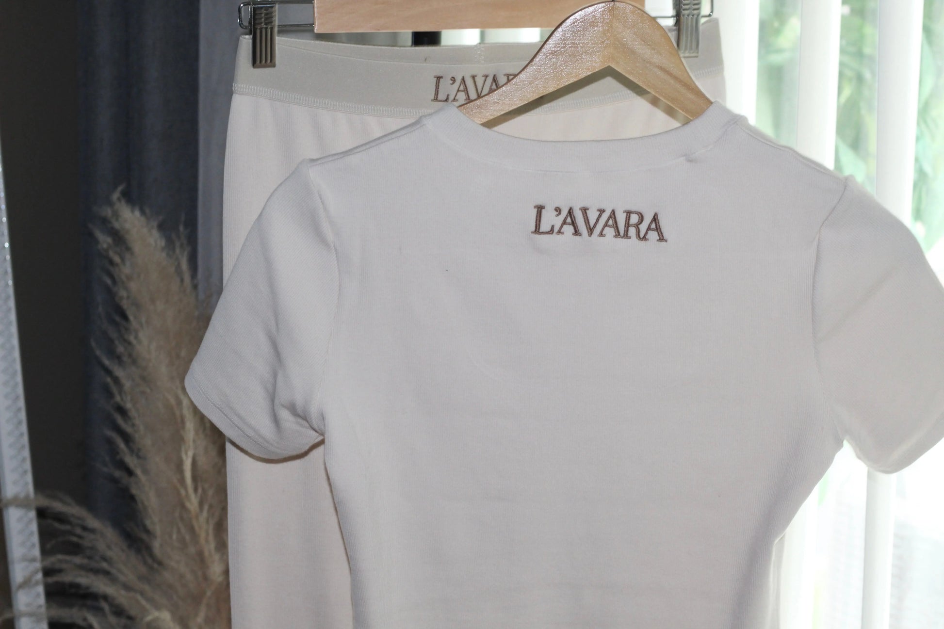 The Oat Milk Lounge Set by L’Avara & Co. is designed for the woman who wants to feel luxurious even on her softest days. Made from a ribbed stretch fabric that hugs you in all the right places, this elevated two-piece includes a short sleeve top and high-waisted leggings—complete with the L’Avara name stitched in soft focus elegance.